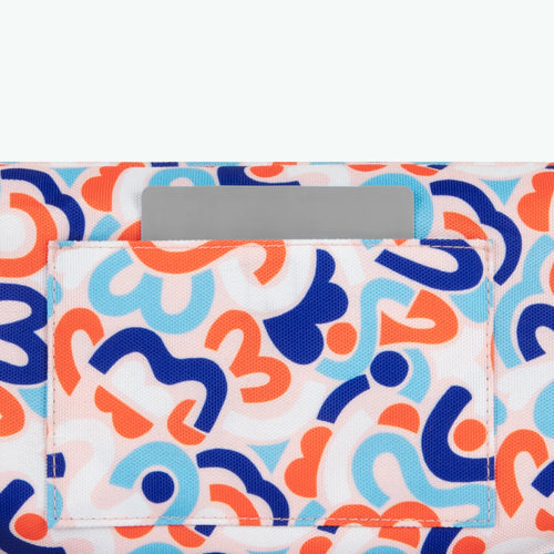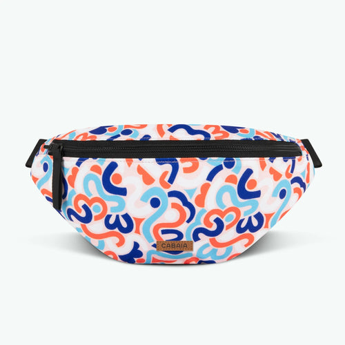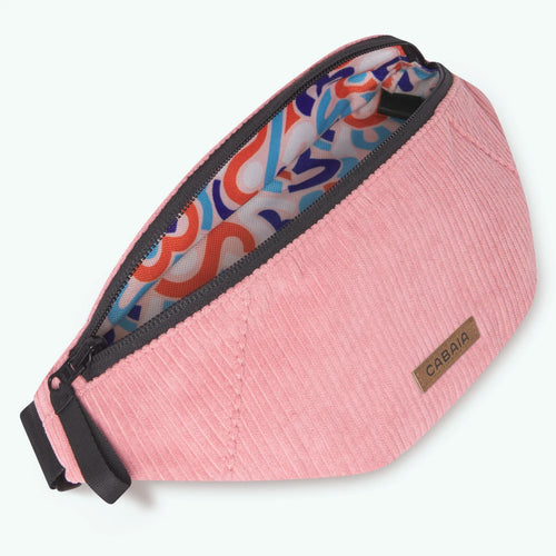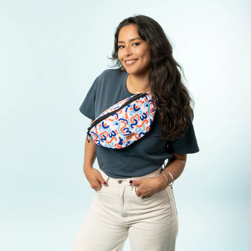 Le sac banane comprend un compartiment principal où vous pouvez ranger vos essentiels et une poche de la taille d'une carte bleu du côté motif.